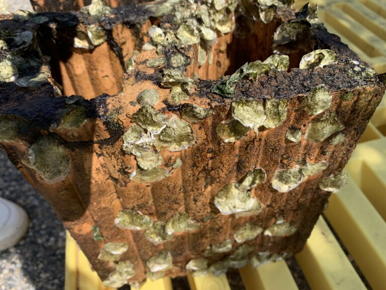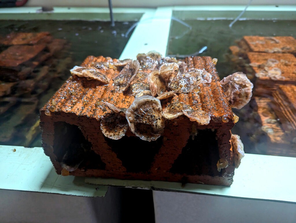 In a recent experiment, researchers compared substrates for oyster settlement. Materials including granite, mussel shells, concrete and roof tiles were assessed (Ter Hofstede et al., 2024). While the roof tiles in this study didn’t exhibit the highest settlement rates among these materials, clay tiles did show respectable rates of settlement. Similar findings have been reported in other studies, such as one conducted by Colsoul et al, who attributed clay’s effectiveness to its high silicate and calcium magnesium content, as well as its rough surfaces, resembling the composition of shells (2020).